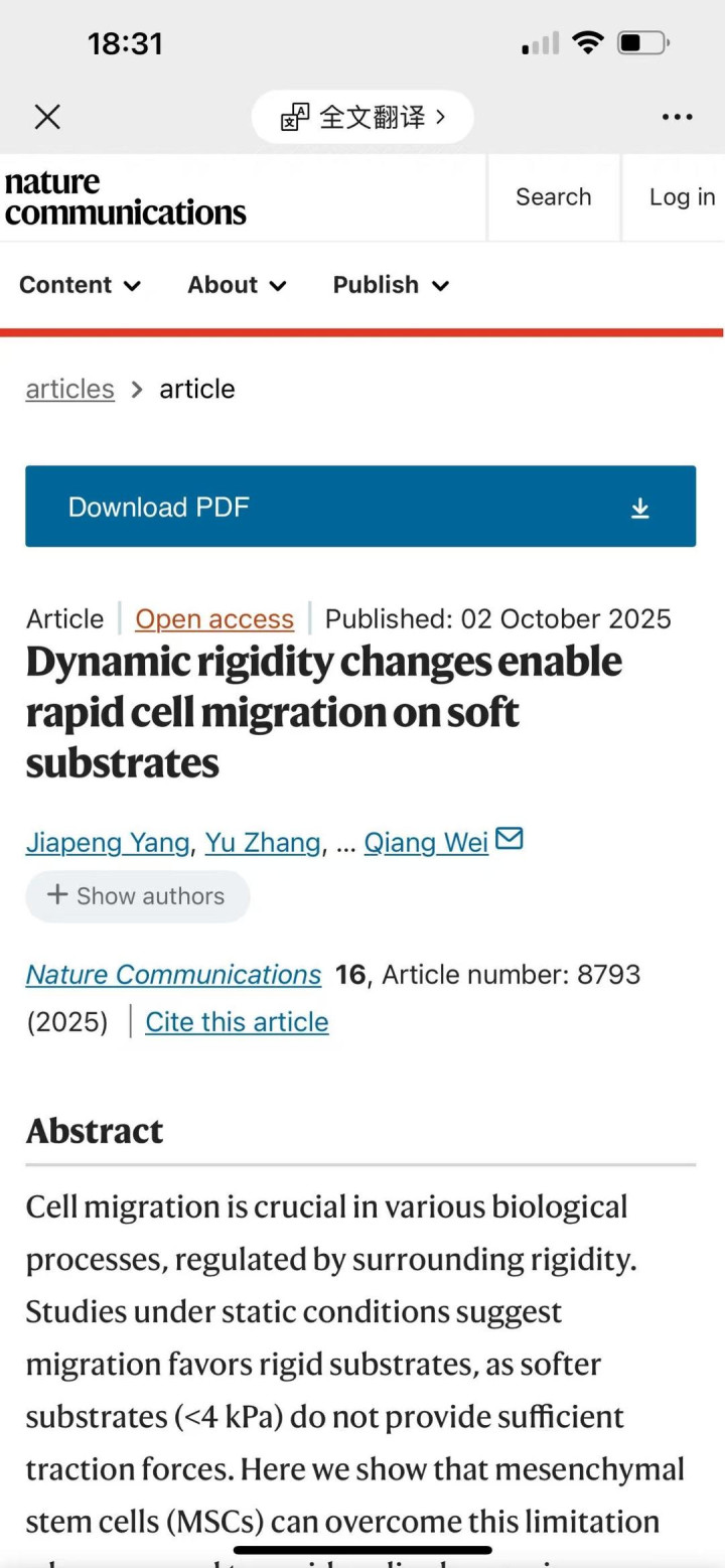 最新研究颠覆了这一认知。10月2日,红星新闻记者从四川大学获悉,近日,南京大学曹毅教授、四川大学魏强教授,以及济南微生态生物医学省实验室顾晓松院士、江春平教授等在NatureCommunications发表成果,发现当基底刚度在1.6~2.2千帕之间以1分钟频率快速循环时,细胞迁移速度提升了36倍以上,甚至超过硬基底上的速度。